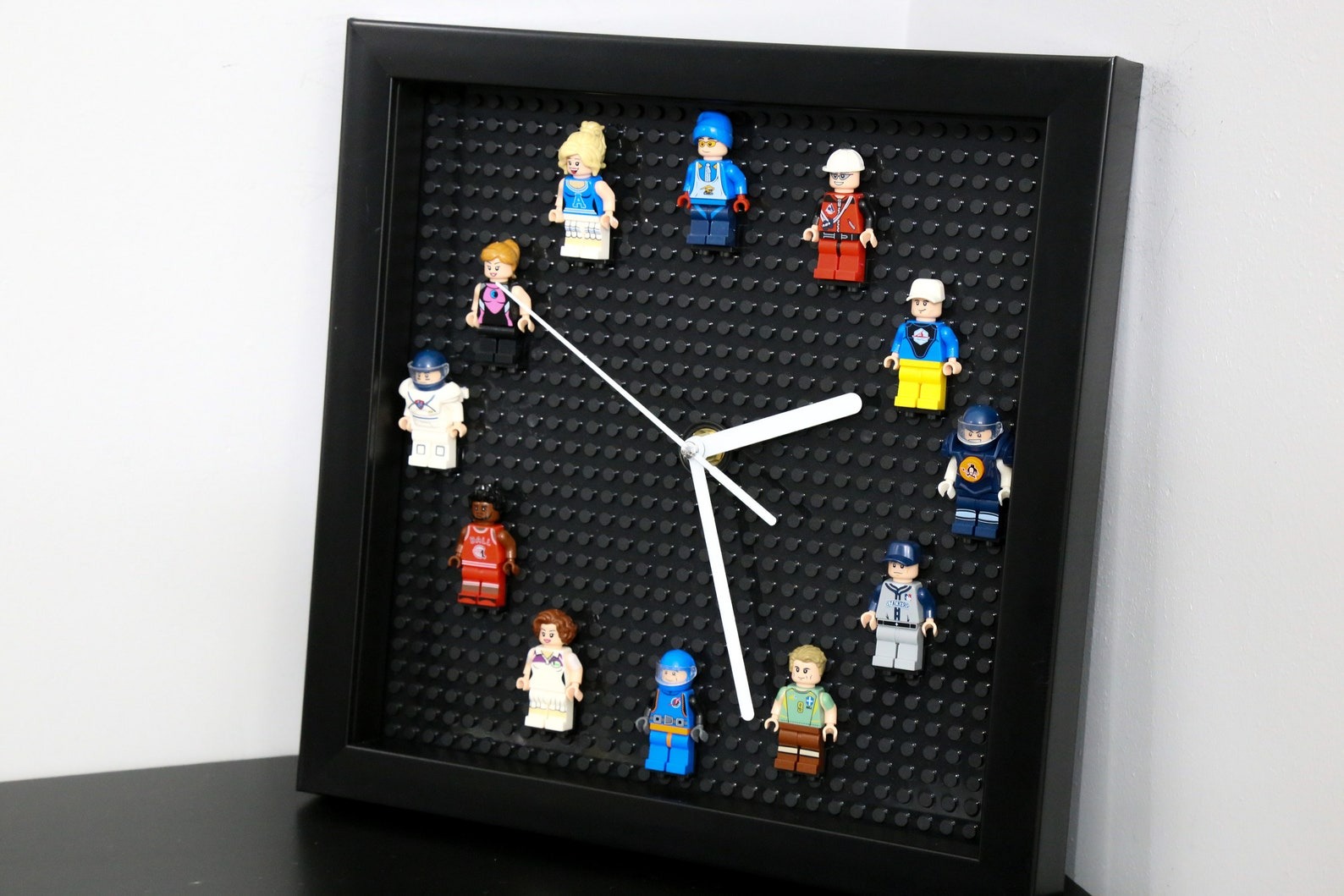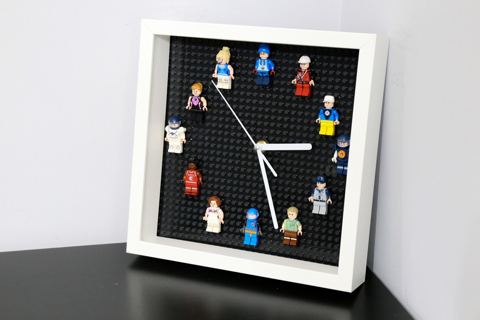 Wall clock made of mini figures. Classic design for kids and adults. Twelve different athlete professions are included.