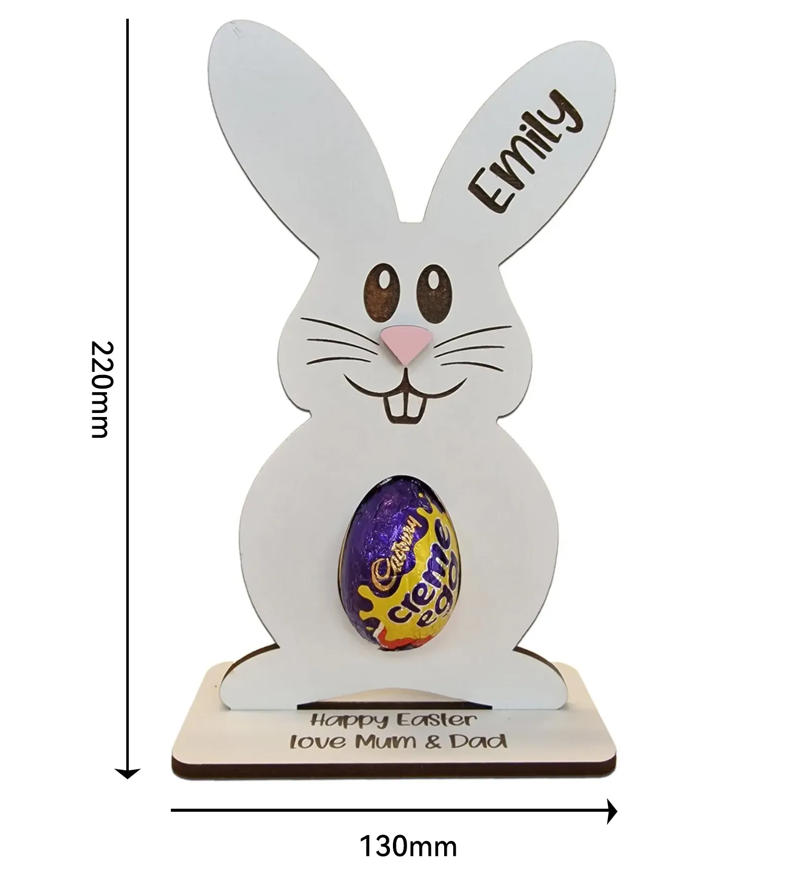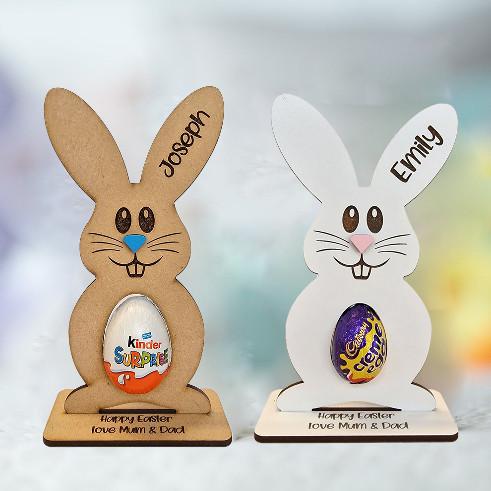 Each Bunny is personalized with the name of your choice on his/her ear and the perfect size belly whole to fit a Kinder Surprise Egg.